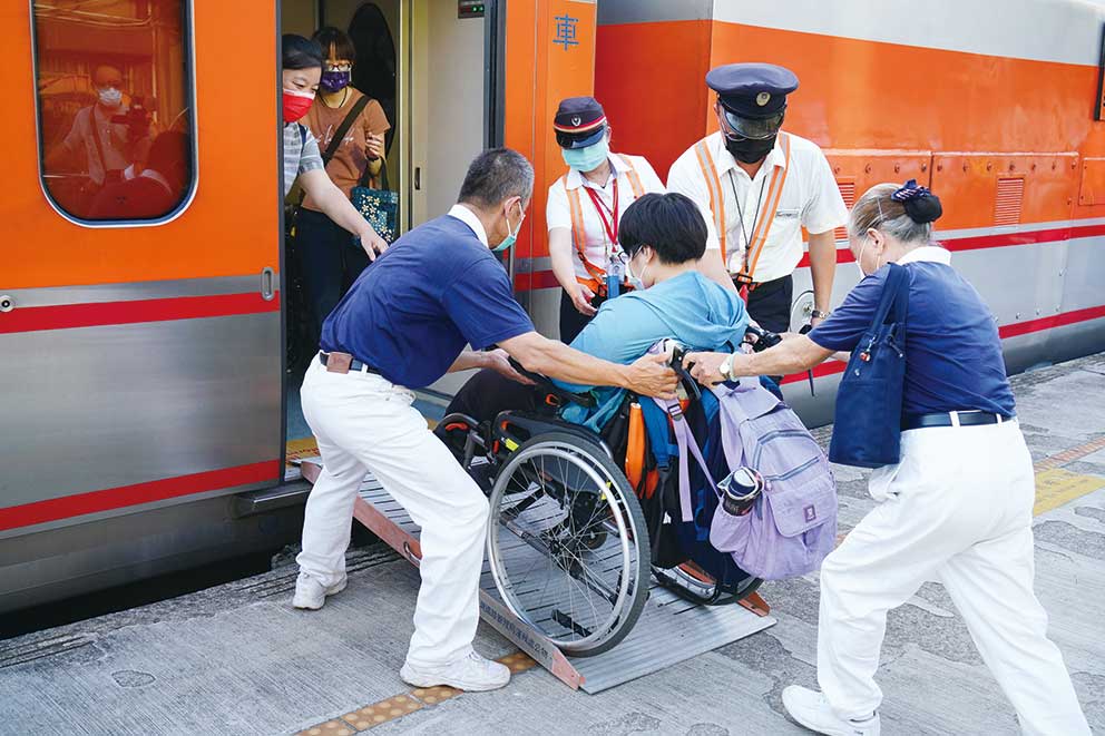 火車進站,鐵路局站務人員熟練地放置無障礙設備,志工敏捷的攙扶來自學生下車。有的協助部分學生坐輪椅,有的陪伴行動稍不便但自行行動的學生,穿行於人群之中的安全,避免跌倒碰撞……