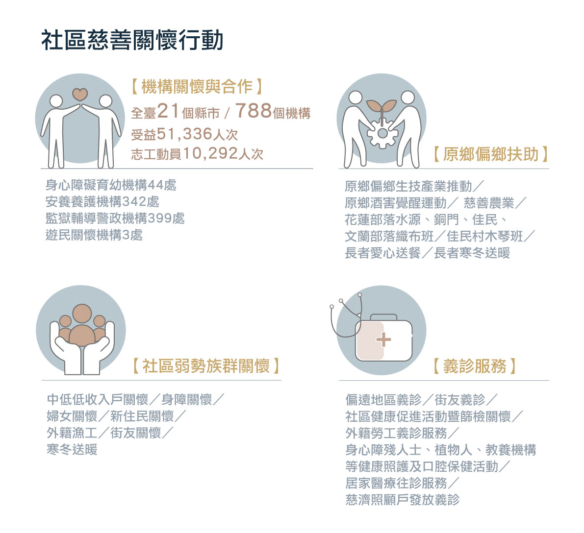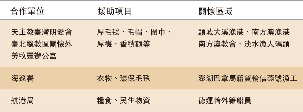 寒冬時節,慈濟以「跨宗教慈善合作、政府與民間共善」的模式,提供禦寒保暖外套、毛帽、厚毛毯、厚襪子等物資,讓北海岸、東北角海岸等之外籍漁工等3248人次,並且送來熱飲與點心、量身及發放等,讓他們在寒冬中感受到被關心和照顧的溫暖。