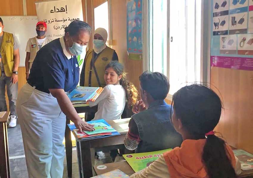 馬夫拉克省(Mafraq)為慈濟志工長期關懷的區域,其中距離敘利亞邊境不到六公里的虎威賈村(Huweyja),居住著一群敘利亞難民。慈濟約旦分會定期前往發放生活物資,並從2018年12月開始補貼老師的薪水,讓難民孩童的教育能延續。由於當地聚居的戶數已從原本的20餘戶,繁衍至40餘戶,孩童的人數也隨之增加,原本充當教室的鐵皮屋,空間已不敷使用,慈濟志工為提供孩子良好的學習環境,決定捐贈一間簡易教室及兩間廁所,也委請長期合作的塔拉博特社區中心(Tarabot Community Center),為孩童製作二十五套課桌椅。駐約旦臺北經濟文化辦事處亦共襄盛舉,捐贈一批書籍,孩子們坐在嶄新的教室裡,從志工及來賓手中接過新書,如過新年般歡喜。