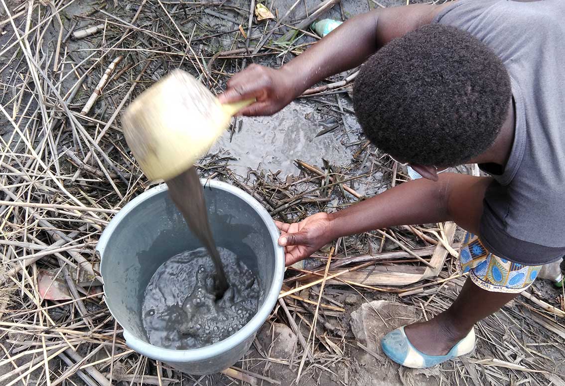 跋山涉水,至土坑、池塘等開放性取水點汲水,是當地孩童每日的工作,除了危險,罹患瘧疾機率也相對高。