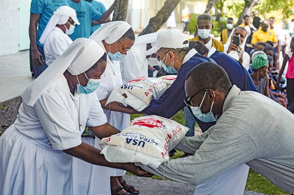 8月14日海地,發生規模7.2強烈地震,多處房屋坍塌損毀,造成嚴重傷亡。8月16日又遭遇熱帶風暴葛雷斯(Tropical Depression Grace)侵襲,引發暴雨和大風。9月1日起,慈濟志工組成賑災團隊來到海地,並與明愛會(Caritas Ayiti Haiti)、慈幼會(Don Bosco)攜手,為災民送上即時所需,每個家庭都能領到37.4公斤,足以供應6到8個家人食用一個月的物資,除了大米,還有包含豆子、玉米碎、義大利麵、通心粉、大米、油、鹽等之糧食袋。