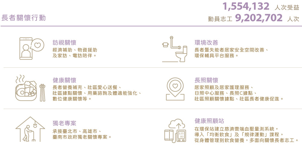 面對2025年臺灣超高齡社會, 慈濟從點線面作全方位長者關懷,營造「安穩家園、美善社區」 慈悲關懷長者的友善社區 有愛的祥和社會。