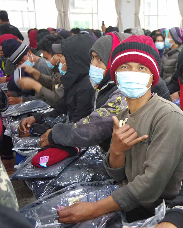天主教關懷外勞牧靈中心,長年在全臺34 個港口默默地關懷外籍漁工,提供生活所需。慈濟自2019 年起開始支援物資給予牧靈中心,2021 年首次在淡水、基隆、宜蘭等三港口舉辦物資發放活動,關懷漁工生活所需。2023 年,天主教牧中心與慈濟志工再次攜手合作,在新北龜吼、淡水、基隆、澎湖、馬公等漁港陸續展開禦寒物資發放,送上外套和保暖襪,共同為超過 千名漁工朋友帶來溫暖。