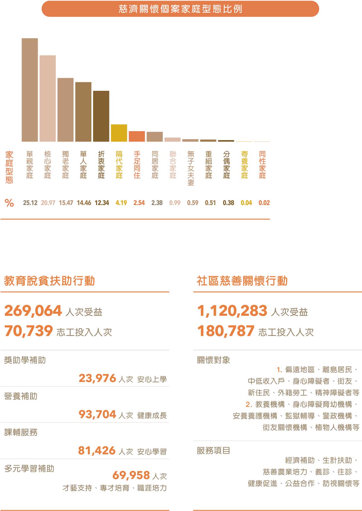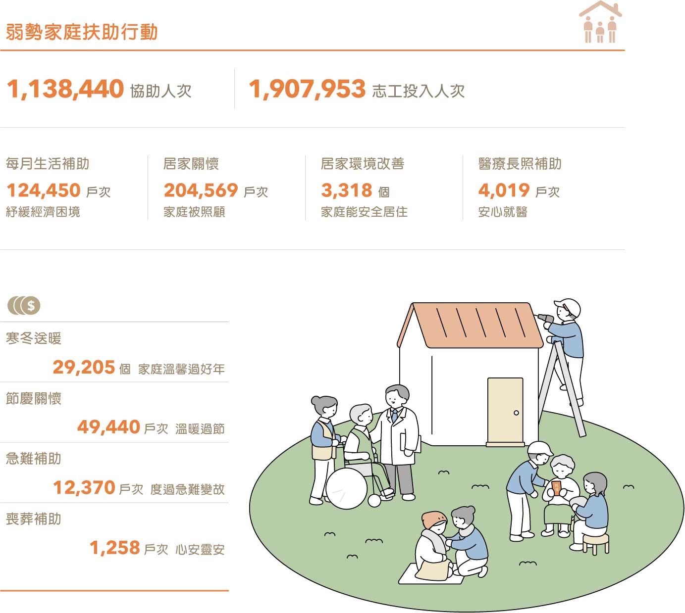 家庭,是社會的基本單位。隨著少子化、高齡化人口趨勢、社會環境變遷及價值觀的改變, 臺灣的家庭狀況呈現多元面貌,單親、單人、隔代、小家庭等逐漸增多。 2023 年慈濟關懷扶助個案類型,單親、小家庭和獨居老人共佔 92.5%。面對家庭結構縮小、家庭功能逐漸消失的狀況,我們以家庭為中心、社區為基礎,加強多元關懷行動。根據不同年 齡層需求提供協助,同步從經濟支援、心理照顧到居家環境等,多方面提供支援和服務,透過 「全人、全家、全程」的支持力,確保有效應對變遷,提供適切的協助與關懷。