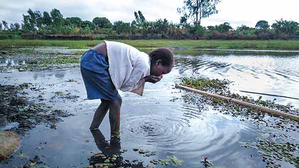 當地水資源缺乏嚴重,即使有,大部分也是不受保護 的水窪、池塘,孩童們掬起泥水窪、池塘的水直接就口 喝,在少雨乾旱的辛巴威見怪不怪。