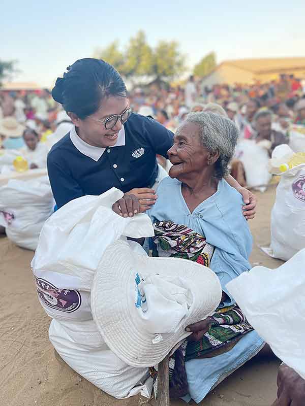 聯合國近年連續表示,馬達加斯加正處於現代歷史上,全球首波由氣候變遷引發飢荒的邊緣,居民2,900 萬人,七成是貧窮人口,深受饑荒之苦。慈濟在2022 年開始,持續在非洲東南部的馬達加斯加,與當地的獅子會合作,援助因風災受苦的飢民,緊急援助,並發放了生活必需品,如大米、豆子、糖和肥皂,以幫助受影響的社區。同時,執行長期的支持計劃,提供種子和農具,幫助居民恢復農業生產,以及提供營養補給品,以改善食物安全。2023 年莫三比克慈濟志工更是首次跨國來交流,帶動實業家,協助西部圖利亞拉貧困長者、愛滋病家庭,發放糧食包。居民開心的說,「我們長久以來的生活,原本就是非常飢餓,現在終於有食物了」。