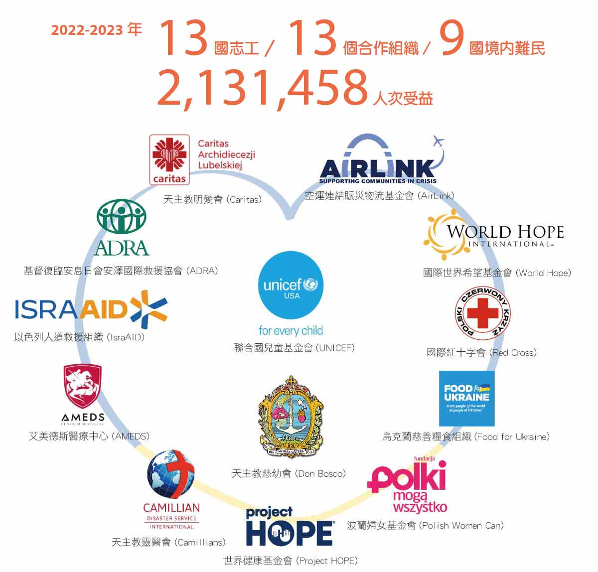 儘管無法運送大量物資,透過慈濟華沙辦公室和當地志工的努力,與機構的合作, 醫療和糧食援助也得送到達烏克蘭。慈濟與多家機構合作,包括空運連結賑災物流 基金會、長榮航空、以色列人道救援組織等,共同協助烏克蘭人。另外,捐贈醫療 器材給基輔的醫院,每年約可救助超過五萬人。