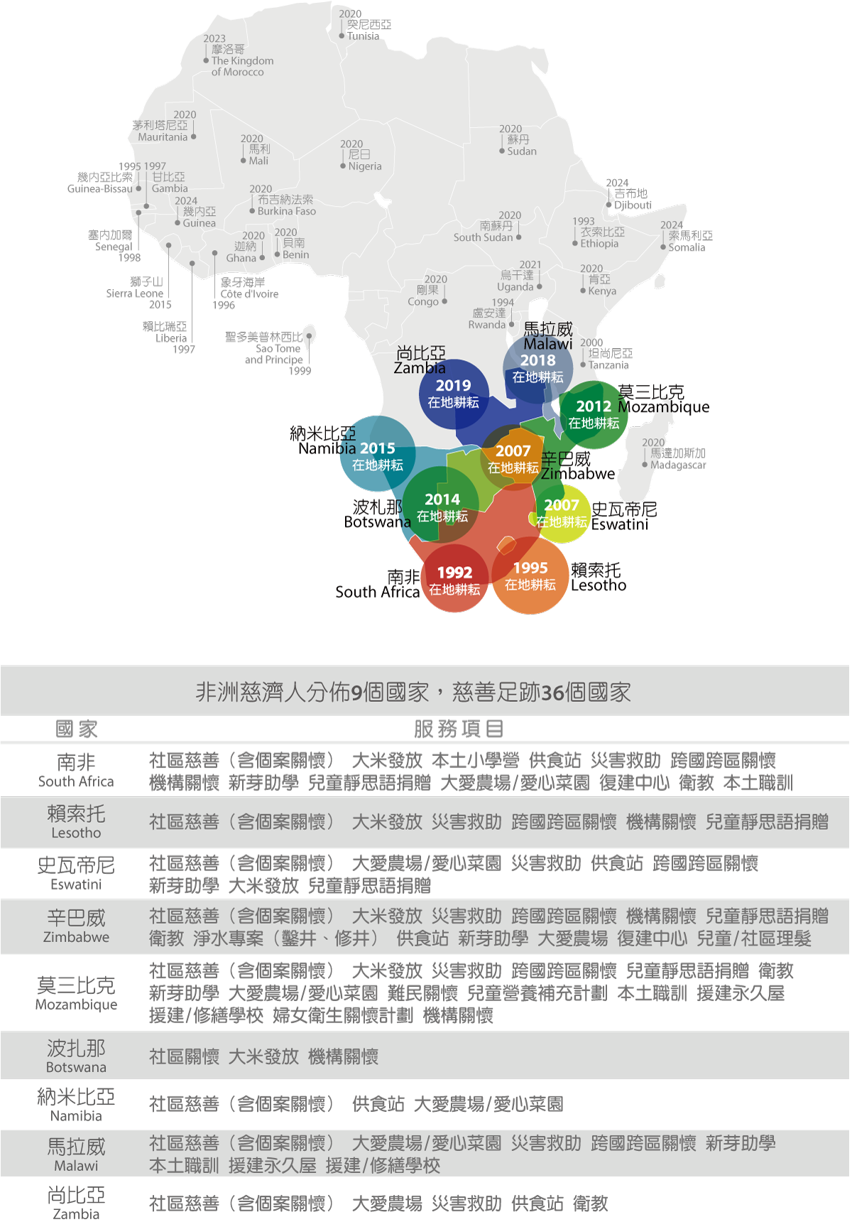 慈濟大愛農場計畫,以提升氣候適應 力和創建可持續性糧食系統為目標,在莫三比克、史瓦帝尼、馬拉威、尚比亞等非洲國家執行, 幫助當地社區改善糧食安全,增強對氣候變遷的抵抗力,透過推廣有機農業和生態友好的耕作 方法,支持當地農民採用更環保的農業實踐,從而提高土地的生產力和可持續性。此外,透過 教育和培訓,傳授居民有關氣候智慧型農業的知識和技能,促進當地社區的可持續發展,減少 貧困,並改善當地居民的生活。