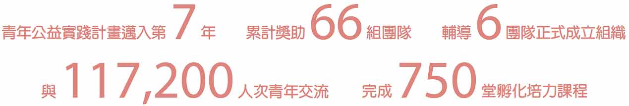 在社區、學校,推動各項青年公益創新專案,以國際視野、公益創新培植人才,開闊新世代公 益教育與實踐力、提升競爭力,帶領青年參與公益、掌握永續趨勢、共同尋找社會議題解方,實 踐社會共好力量。