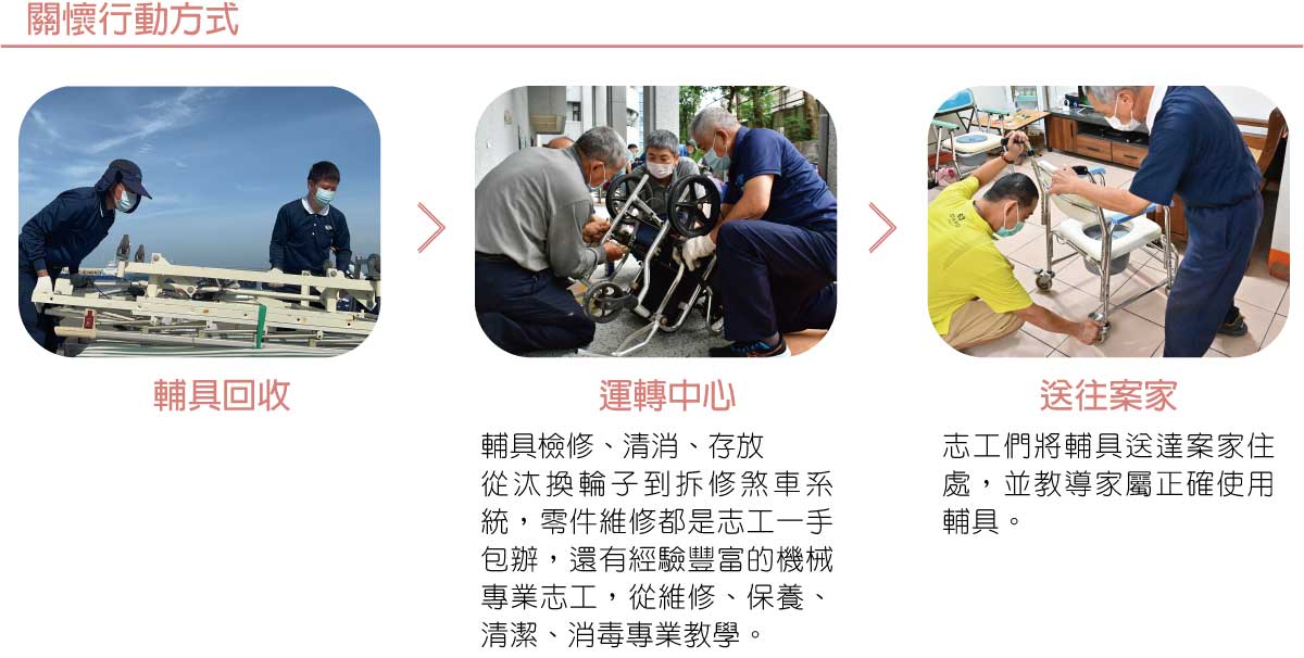 建立環保輔具回收流程,提供安全、衛生 與適切的輔具給需求者,不僅為大眾提供 良好健康福祉,亦協助弱勢家庭緩解經濟 困難,促進環境永續。