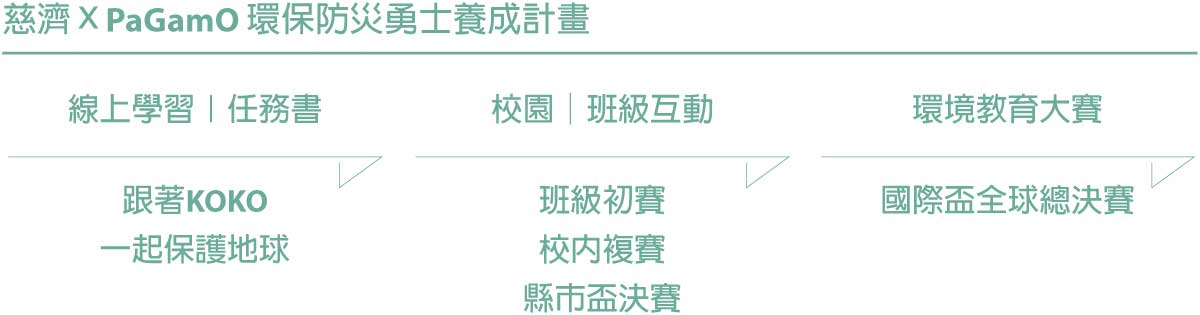 「慈濟x PaGamO環保防災勇士PK 賽」邁入第三屆, 這是慈濟與幫你優、環境部、教育部資訊、科技教育 司的跨界合作,共同推動「環境教育與防災知識」。 學生與老師可以透過競賽,關注全球暖化、極端氣候 議題。每位參賽選手,也寫下參與環保實作的學習心 得,讓線上學習,能轉為愛地球的具體行動,朝向提 升全民防災意識及環境教育素養的目標。