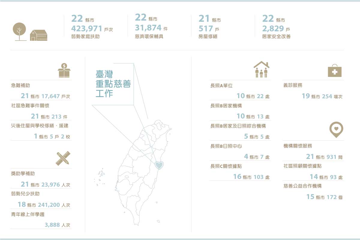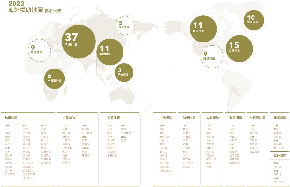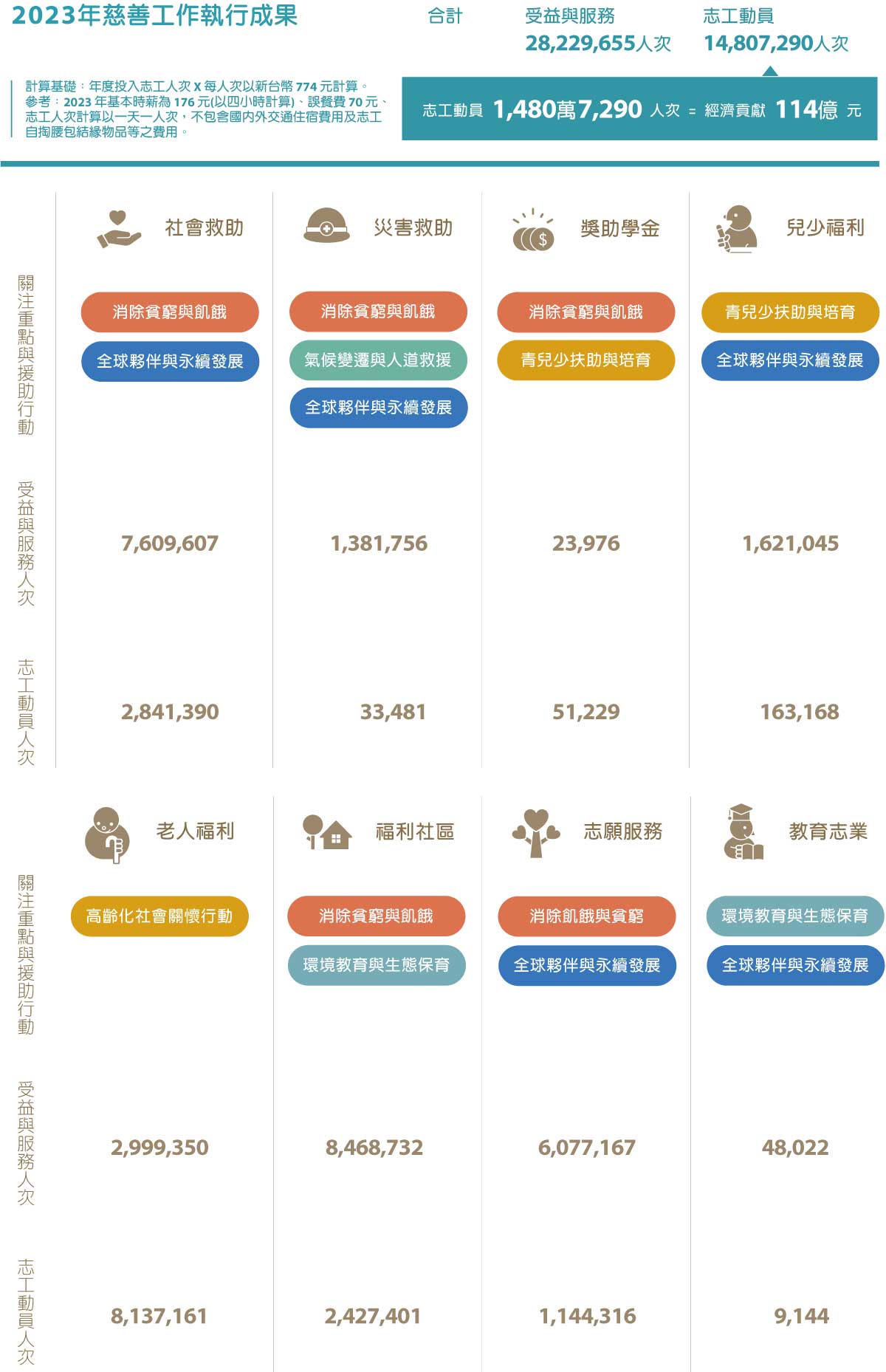 在臺灣,濟貧扶困的行動從個人、家庭和推展到社區,培育青少年,關懷長者,並重視防災減 災和災害救助。不僅提供即時的關懷,並通過創新的慈善計劃擴大合作,結合公私部門、企業的 力量,幫助弱勢、貧困和受災者擺脫困境,幫助他們自力更生,擺脫貧困的循環。 永續發展是全球關注的問題。根據聯合國於2023 年9 月發布的最新報告,36 個永續發展子目標中,只有兩個目標正在實現中,八個目標的進展正在惡化,其餘目標進展緩慢或停滯不前。 慈濟同時將環境保護、社會責任和治理理念融入行動中,守護更多受災群眾,共同打造一個可 持續發展的未來。